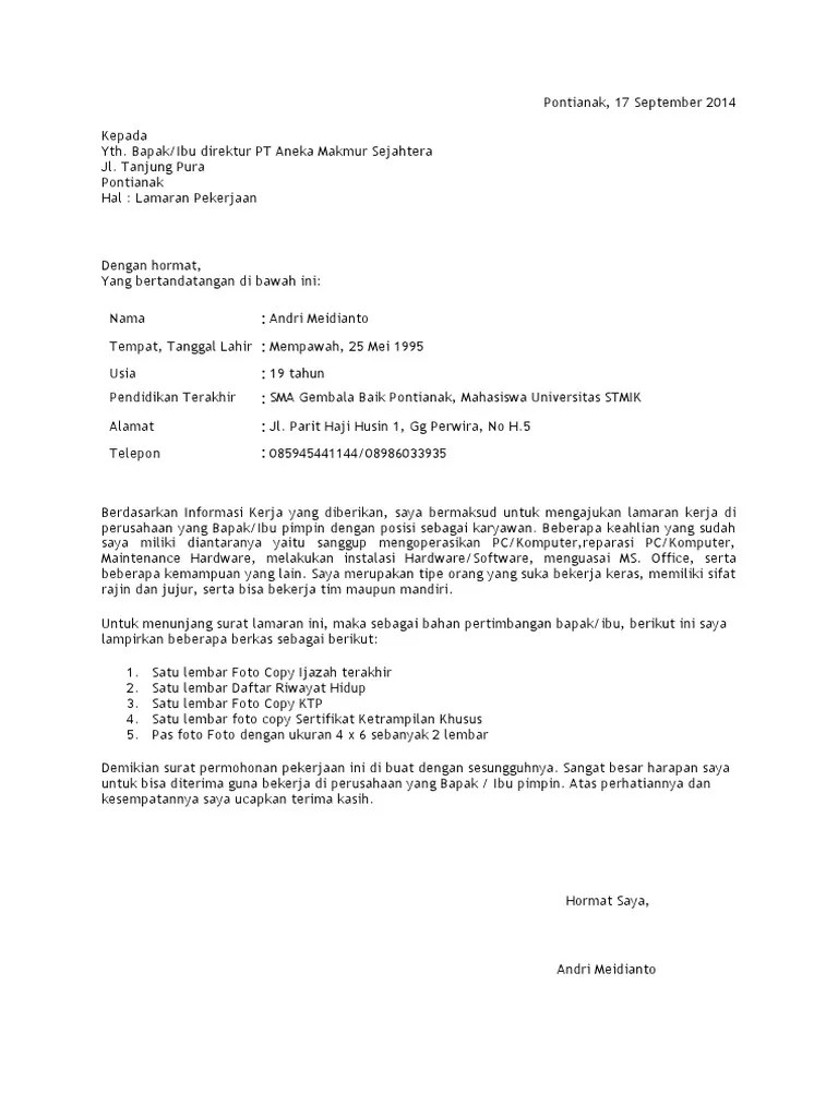 Jenis surat lamaran ini dibuat dengan memasukkan data riwayat hidup dalam isi surat lamaran atau disebut dengan surat lamaran kerja model gabungan. Pada surat lamaran pekerjaan, terdapat ucapan terima kasih yang harus ditulis sesuai dengan sistematika surat berdasarkan pilihan kata/diksi. Oleh pengajarku diposting pada juli 20, 2021. surat lamaran pekerjaan biasanya bersifat formal atau resmi misalnya surat untuk melamar pekerjaan menjadi karyawan ataupun jabatan tertentu sesuai dengan iklan yang ditawarkan. Bahasa gaul tidak dianjurkan dalam penulisan surat ini. Berikut yang anda butuhkan terkait surat lamaran kerja tulisan tegak bersambung. Sebenarnya membuat surat lamaran kerja yang baik dan profesional itu adalah cukup dengan memenuhi 2 sifat : Sedangkan cv adalah daftar riwayat hidup yang berisikan perjalanan hidup seseorang yang dilihat dari pendidikan dan pekerjaan apa saja yang pernah dilakukannya. Berikut ini isi, unsur kebahasaan, sistematika surat lamaran pekerjaan:. Di samping surat lamaran ini ditujukan untuk para. Hal ini adalah fakta dimana ada banyak sekali surat surat lamaran … Nah sobat penulis cilik, jika kamu ingin bekerja setelah lulus sma ataupun kuliah sambil bekerja, maka wajib mengetahui sistematikanya. surat lamaran kerja yang dijadikan disatukan dengan data riwayat hidup atau curriculum vitae.